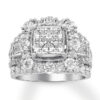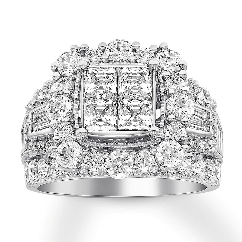This impressive engagement ring captures the surprise and delight of an engagement. Round diamonds halo four brilliant princess-cut diamonds to create the focal point, while baguette diamonds shimmer on each side of the generous band. Even more dazzling round diamonds adorn the band, bringing the total diamond weight to an impressive 4 carats. The ring is fashioned in 14K white gold.