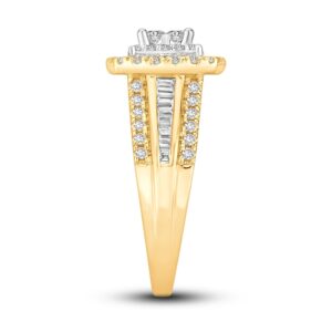 This gorgeous two-tone engagement ring showcases four stunning princess-cut diamonds at its center, set in iconic 14K white gold. Brilliant round diamonds halo the center diamonds, and another frame of round diamonds set in 14K yellow gold brings a beautiful contrast. The band sparkles with round and baguette-cut diamonds, giving the ring a total diamond weight of 1 carat.