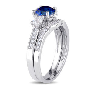 6.0mm Blue and White Sapphire with 1/8 CT. T.W. Diamond Three Stone Bridal Set in 10K White Gold
